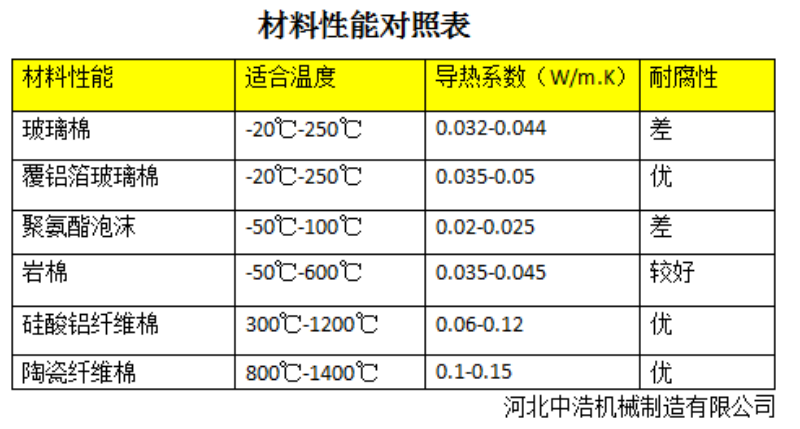 明確溫度范圍,一般分為低溫(-50 ℃-常溫)常見冷庫管道和液化天氣管系等,注意防止結(jié)露。中溫管道(常溫-300 ℃,常見如蒸汽或熱水系統(tǒng),而高溫(300 ℃-1200 ℃),如鍋爐煙氣或高溫反應(yīng)器管道。還需考慮介質(zhì)特性,如是否屬于腐蝕性氣體或酸堿介質(zhì),流體流速是否過大,如壓縮機(jī)出口流速_大。還需注意環(huán)境要求,如化工防爆區(qū)需要阻燃材料,防火等級(jí)要求高,如海洋環(huán)境或潮濕地下室需要防潮、防腐。具體可參照下面材料性能對(duì)照表選擇: