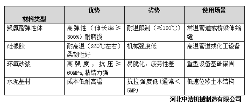 力學(xué)性能主要體現(xiàn)在彈性模量和抗拉抗壓強度以及斷裂韌性,低彈性材料柔韌性好可適應(yīng)_大位移變形,減少應(yīng)力集中,高彈性材料(如混凝土)易因剛性過渡而開裂??估箟簭姸雀邚姸炔牧先纾ōh(huán)氧樹脂)可承受更大載荷和頻繁位移,使用壽命長。而低強度材料易在動態(tài)載荷下疲勞損壞。針對斷裂韌性問題,可用高韌型材料,可抑制微小裂紋引起的斷裂。從耐久性考慮高溫環(huán)境載300℃以上可選用硅酮膠等耐溫材料,普通材料極易發(fā)生脆化??紤]耐化學(xué)腐蝕化工廠環(huán)境需要抗酸堿材料,例如氟橡膠,避免腐蝕失去密封性。而耐腐性需要選擇對紫外線敏感材料如(聚氨酯)添加抗老劑,避免使用開裂現(xiàn)象??紤]界面強度和搜索率,如低粘性材料(如普通水泥砂漿)極易與金屬基體脫粘,導(dǎo)致滲漏。而高收縮材料(如固化環(huán)氧樹脂)可能因收縮應(yīng)力引發(fā)斷裂,需要添加膨脹劑。從膨脹系數(shù)考慮,不同材質(zhì)不同。從施工適應(yīng)性考慮流動性和固化時間,狹窄縫隙需高流動材料,可用自流平聚合物,確使填充緊密。從固化時間考慮,如果搶修時間短可用雙組分聚氨酯,凝聚時間_短。但需要控制施工進度。一般情形可參照材料對比表: